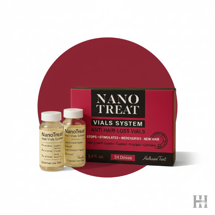 Are you dealing with serious, stubborn, or genetic hair loss? Unfortunately, a widening part, a receding hairline, or visible scalp is a major, stressful concern in Egypt. Therefore, when basic sprays aren’t enough, you need a clinical-strength solution. The Nano Treat Vials are your professional, “kitchen-sink” intensive hair loss vials. In short, this is a comprehensive topical formula, combining *all* the major patented actives to fight hair loss from every single pathway.